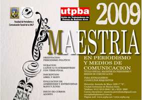 La Unión de Trabajadores de Prensa de Buenos Aires (UTPBA-CTA) informó que esta abierta la inscripción para el ciclo 2009 de la “Maestría en Periodismo y Medios de Comunicación”, que dictan conjuntamente la Facultad de Periodismo de la Universidad de La Plata (UNLP) y el Observatorio de Medios de la organización de los periodistas.