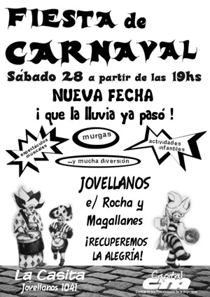 Desde hace años que los responsables de este proyecto venimos trabajando con niños y jóvenes aunque hace poco que llegamos a esta Casa en Jovellanos 1041. Y es así que queremos compartir esta llegada, el sábado 21 de febrero, con una fiesta de carnaval.”, anunciaron los compañeros a través de un volante.