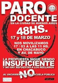 * Ratificar el paro docente convocado por UTE y todos los sindicatos docentes de la Ciudad de Buenos Aires los días 17 y 18 de Marzo, como así también la movilización del 17 a las 11.00 en Chacabuco y Avenida de Mayo hacia la Jefatura de Gobierno.