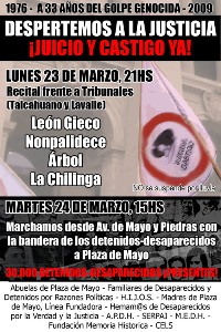A 33 años de golpe genocida, se realizará el 23 de marzo, a las 21.00, con el lema "Despertemos a la Justicia: ¡Juicio y Castigo Ya!", frente a los Tribunales, en Talcahuano y Lavalle, un recital y acto público con entrada gratuita. Actuarán León Gieco, Nonpalidece, Arbol, La Chilinga y otros artistas. Y desde las 19.00, transmisión en vivo por FM La Tribu 88.7 (www.fmlatribu.com).