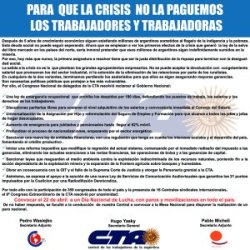 Bajo el lema "Para que la crisis no la paguemos los trabajadores y trabajadoras", en una solicitada publicada en un diario de circulación nacional por la Central de Trabajadores de la Argentina, con la firma de Hugo Yasky, Pablo Micheli y Pedro Wasiejko, secretarios general, primer y segundo adjunto, respectivamente, se afirma textualmente: