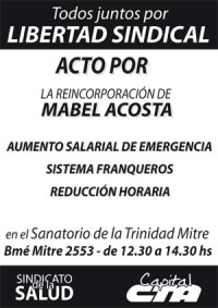 Mabel Acosta fue candidata a delegada de sector en el año 2005, candidata a congresal de ATSA en el 2008 y este año, fundadora del Sindicato de la Salud de la Capital Federal, organización enrolada en la CTA.