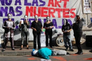 Espectros humanos con las máscaras de los personajes de la película Scream y el muñeco "Paco" tirado en el pavimento, fue la impactante escenografía montada ayer a la mañana durante tres horas frente a la sede la Universidad Católica de Córdoba (UCC), en Obispo Trejo al 300.