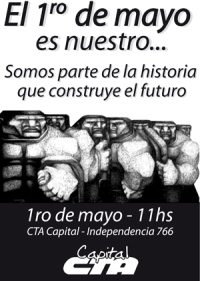 Este 1º de mayo, la CTA Capital en el marco del plan de lucha que se encuentra construyendo y garantizando junto a decenas de organizaciones sociales, políticas, religiosas y culturales de esta ciudad, invita a los compañeros a reunirse en la sede de Independencia 766 para conmemorar el día de los trabajadores.