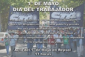 El acto se llevará a cabo el viernes 1º de mayo a las 12.00 frente a la empresa Repsol, y ya confirmaron su presencia ATE, el Sindicato de Empleados Judiciales de Neuquén (SEJUN-CTA); la Asociación Trabajadores de la Educación de Neuquén (ATEN-CTA); el Sindicato de Trabajadores de Reposición Externa (SITREX-CTA); la Cooperativa ADOS; el Sindicato de Seguridad Privada y el Sindicato de Guardavidas de Neuquén entre otras organizaciones populares de la provincia patagónica.
