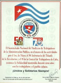 En otro acto, que se concretó el 30 de abril, el Comité Nacional del Sindicato Nacional de Trabajadores de la Administración Pública (SNTAP) otorgó la distinción “Enrique Hart” a los dos dirigentes de la Mesa Nacional de la CTA en reconocimiento a la solidaridad mantenida con los trabajadores y el pueblo cubano.