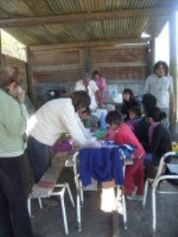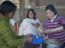 Allí nos esperaban el Pelado, Leo y las compañeras del barrio, mujeres de rostros curtidos y espaldas encorvadas por los vientos de la vida, verdaderas luchadoras y fieles representantes de lo más valioso del género. Predipuestas a poner sus manos en el arte culinario, arte que se hacía cultura, cultura que se hacía pueblo en esas dos, cuantro, seis, doce manos que se confundían, se ayudaban y se estrechaban. Cuchillos, cebollas, zanahorias y ollas, intrumentos puestos al servicio de ese verdadero festín que es la comida, comida que es para todos y todas. Y las sonrisas se dibujaban en los rostros de las compañeras, al compás de la cháchara de la conversación.
