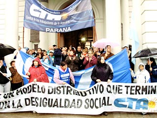Bajo el lema “Por un modelo distributivo que termine con la desigualdad social” se realizó hoy en la ciudad de Paraná paro el acto central en el acceso al túnel subfluvial. Desde allí la manifestación se trasladó al Centró Cívico donde se realizó el acto frente a la Casa de Gobierno.