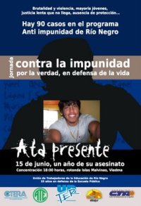 La convocatoria señala que hay 90 casos en el Programa Anti Impunidad de Río Negro. Por ello, a un año del asesinato del jóven se llevará a cabo esta jornada contra la impunidad, por la verdad, en defensa de la vida.