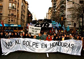 La Central de Trabajadores de la Argentina marchó por las calles de Buenos Aires en repudio a la asonada cívico-militar ocurrida en el país centroamericano. El gobierno de facto que preside Roberto Micheletti suprimió las garantías constitucionales y extendió el toque de queda por nueve días más, mientras las organizaciones sociales denunciaron el incremento de la represión.