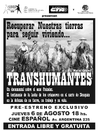 La Central de los Trabajadores de la Argentina Neuquén y ATE Neuquén con la colaboración del Gobierno del Principado de Asturias y SOTERMUN (ONGD promovida por la USO) presenta el jueves 6 de agosto el pre-estreno de TRANSHUMANTES, un documental sobre el caso Faúndez.