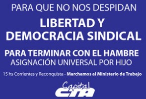 La convocatoria de los compañeros de Capital será a las 15.00, en la esquina de Avenida Corrientes y Reconquista. De allí movilizarán hacia la sede de la cartera laboral bajo las consignas "Para que la crisis del capitalismo no la pague el pueblo, para reclamar una justa redistribución de la riqueza, Asignación Universal por Hijo y la efectiva vigencia de libertad y democracia sindical", de acuerdo a lo que indica el comunicado gremial.