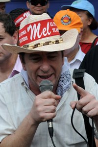 Luego que los representantes de la misión internacional sindical y los dirigentes del frente brindaran una conferencia de prensa, a las 10.30 de la mañana, inició la marcha al final del boulevard Morazán en Tegucigalpa, pasando por la casa del ex presidente Carlos Flores Facusé (uno de los golpistas) y luego por la gran mansión que posee el cardenal Oscar Andrés Rodríguez, que estaba siendo resguardada por un grupo bastante considerable de policías. Ahí solo gritaron algunas consignas de rechazo al cardenal.