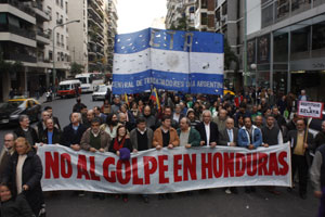 A las 16 horas de hoy partió de la intersección de las Avenidas Santa Fe y Callao una gran columna de manifestantes hacia la Embajada de Honduras. Exigieron, una vez más, el inmediato retorno de Manuel Zelaya al Gobierno de ese país y repudiaron la brutal represión contra el pueblo hondureño por parte del Gobierno de facto.