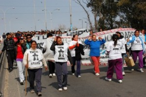 A ritmo de batucada, redoblantes y tambores, portando banderas de la Organización Barrial Tupac Amaru y de la Central de Trabajadores de la Argentina (CTA), hombres, mujeres y niños de diferentes edades, incluso en cochecito, caminaron cuarenta cuadras desde barrio Comercial hasta el edificio Pablo Pizurno, sede del Ministerio de Desarrollo Social.