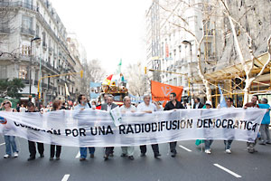 Todos ellos estuvieron al frente de la columna junto a los miembros de la Coalición por una Radiodifusión Democrática, que llevaban una gran bandera y estaban acompañados por dos carromatos del Culebrón Timbal y Carta Popular que encabeza Eduardo Balán. Entre banderas que bregaban "por una ley que nos haga libres", los bombos y las pancartas de distintas organizaciones sindicales y territoriales, la columna llegó al Congreso Nacional, donde se leyó un documento elaborado por la Coalición. Finalmente, dirigentes de ese espacio, que reúne a trabajadores y organizaciones de la comunicación y la cultura de todo el país, entregaron al jefe de la Bancada del Frente para la Victoria, Agustín Rossi, y otros legisladores, la propuesta de la nueva Ley.