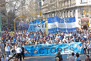 Este mediodía, una nutrida columna de la Central de Trabajadores de la Argentina participó de la masiva marcha que unió la Plaza de Mayo y el Congreso Nacional en respaldo a la sanción de una nueva Ley de Servicios de Comunicación Audiovisual. Previamente, participó de la firma del proyecto en Casa de Gobierno.
