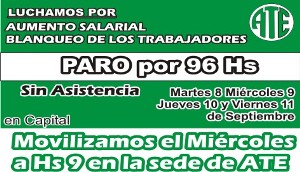 Continuando con el plan de lucha por aumento salarial y terminar con el trabajo en negro en el Estado provincial y Municipal, ATE Jujuy dispuso un paro de 96 horas entre mañana martes y el viernes 11 de septiembre, el cual se cumplirá sin asistencia a los lugares de trabajo.