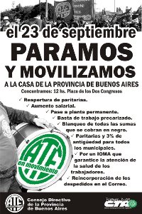 La Asociación Trabajadores del Estado (ATE-CTA) de Buenos Aires, realizará mañana un paro provincial con movilización a la Casa de la Provincia de Buenos Aires en la Capital Federal. Se acordó concentrar a las 12.00 en la Plaza de los Dos Congresos.