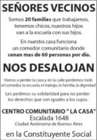 El día 6 de septiembre tuvo lugar en el Centro Comunitario "La Casa" (Escalada 1648), la Asamblea de Parque Avellaneda hacia una Constituyente Social, allí conocimos a las 20 familias que habitan la casa con sus hijos, alrededor de 30 niños, todos escolarizados en instituciones del barrio. En el marco de este encuentro se decidió que era necesario armar acciones colectivas para evitar el inminente desalojo de estas personas, que se encontraba programado para el día 15 de septiembre.