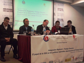 En el marco de la XVI Conferencia Interamericana de Ministros de Trabajo, que comenzó hoy en la ciudad de Buenos Aires y se extenderá hasta el jueves 8, dirigentes de centrales sindicales de toda América participaron hoy del panel “El papel de la OEA (Organización de Estados Americanos) en la integración regional”. La apertura estuvo a cargo de Rafael Freire, secretario de Política Económica y Desarrollo Sostenible de la Confederación Sindical de la Américas (CSA); quien estuvo acompañado por Hugo Yasky, titular de la CTA y Gerardo Martínez, secretario de Relaciones Internacionales de la CGT.