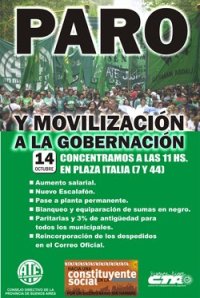 * Aumento salarial; convenio colectivo de trabajo; nuevo escalafón; pase a planta permanente en el Estado provincial; paritarias para los trabajadores municipales; devolución del 3% por antigüedad; pase a planta permanente; por la reincorporación de los despedidos del Correo oficial; por aumento de emergencia en la sectorial civiles de las FFAA; convocatoria a paritarias; por el fin de la precariedad laboral en los estados nacional, provincial y municipal.