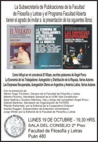 La presentación es este lunes 19 de octubre a las 19.00 en la Sala de Consejo, Puán 480, 2º piso. Hablarán el decano de la Facultad, Hugo Trinchero, Alberto Piccinini (UOM Villa Constitución), Sara Valdivia y Gustavo Martinez (hija y amigo de Angel Porcu), Gabriel Martinez (FeTERA-CTA), Plácido Peñarrieta (presidente de la Cooperativa Chilavert), Andrés Ruggeri (subsecretario de Extensión de la Facultad y Director del Programa Facultad Abierta) y Jorge Winter (Prosecretario de Publicaciones de la Facultad de Filosofía y Letras).