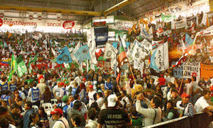 Del techo alto, colgaban banderas del UNE de La Colorada, Aluminé, Mariano Moreno, Zapala, Ramón Castro, Covinco, alrededor, sobre las gradas, banderas provinciales de las organizaciones, sobre colores, El Hambre es un Crimen, ocupando un lugar central. Las bandejas superiores ofrecían un cuadro de chalecos, gorras y remeras rojas que decían UNE en letras de color blanco. No faltaban los bombos, los cantos de la juventud a los que De Gennaro arengaba diciendo que “tenemos un compromiso de vida, que son nuestros pibes y nuestros viejos. Esto es imparable” anunciaba, eufórico, “lo sentí anoche cuando veíamos a los pibes mapuches, lo vi en millones que caminan, en la Juventud de la CTA, aparecieron los chicos del 2001” gritó, y los bombos, empuñados por muchos de esos pibes, sonaron y retumbaron en el Ruca Che.
