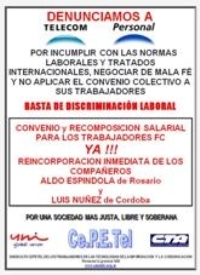 En un comunicado de prensa difundido por CePETel (personería gremial 650) "denuncia públicamente a la empresa Telecom de Argentina por la constante obstaculización a la negociación paritaria, formalmente abierta en el año 2005 con nuestro sindicato, utilizando cuanta dilación administrativa esté a su alcance, castigando salarialmente y profesionalmente a los trabajadores que ilegitima y arbitrariamente tiene mal encuadrados como fuera de convenio, hasta llegar en algunos casos a reprimir con despidos, para deprimir la organización gremial de dichos trabajadores, como el reciente caso del compañero Aldo Espindola en Rosario".