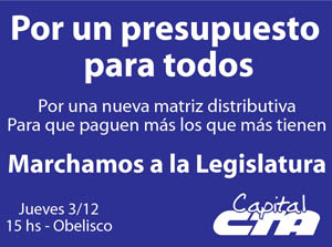 La CTA de la Capital Federal se movilizará hacia la Legislatura hoy lunes 7 de diciembre a las 15.00, oportunidad en la que se tratará el Presupuesto 2010 para la Ciudad Autónoma de Buenos Aires. El objetivo de la marcha es exigir que se modifique el Presupuesto presentado por el Gobierno macrista para el año que viene.