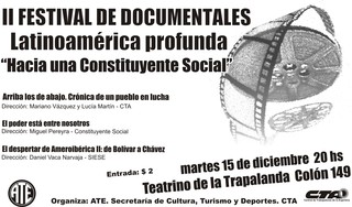 En el Teatrino de la Trapalanda, en Colón 149 de la ciudad de Río Cuarto, se realizará el II Festival de Documentales Sociales: Latinoamerica profunda, hacia una Constituyente Social. La cita es este martes 15 de diciembre, a las 20.00, y la entrada tiene un costo solidario de 2 pesos y para afiliados de ATE sin cargo.