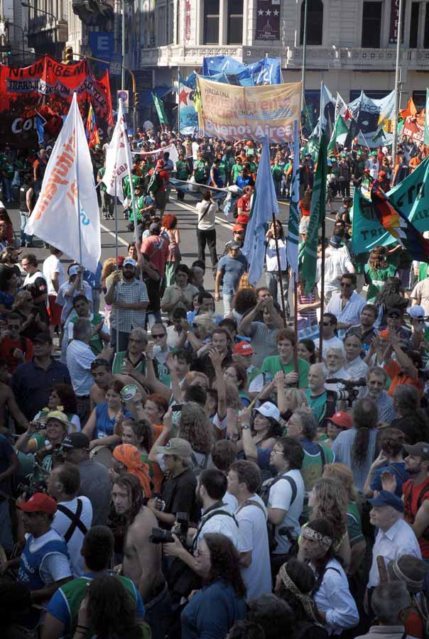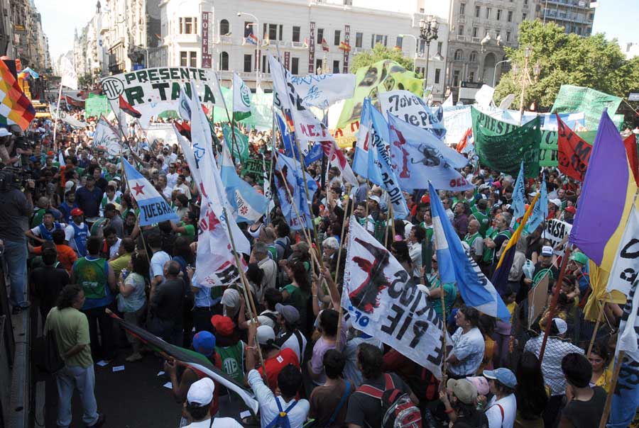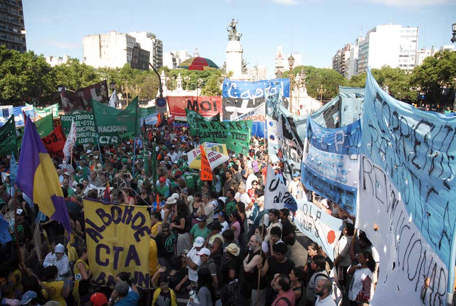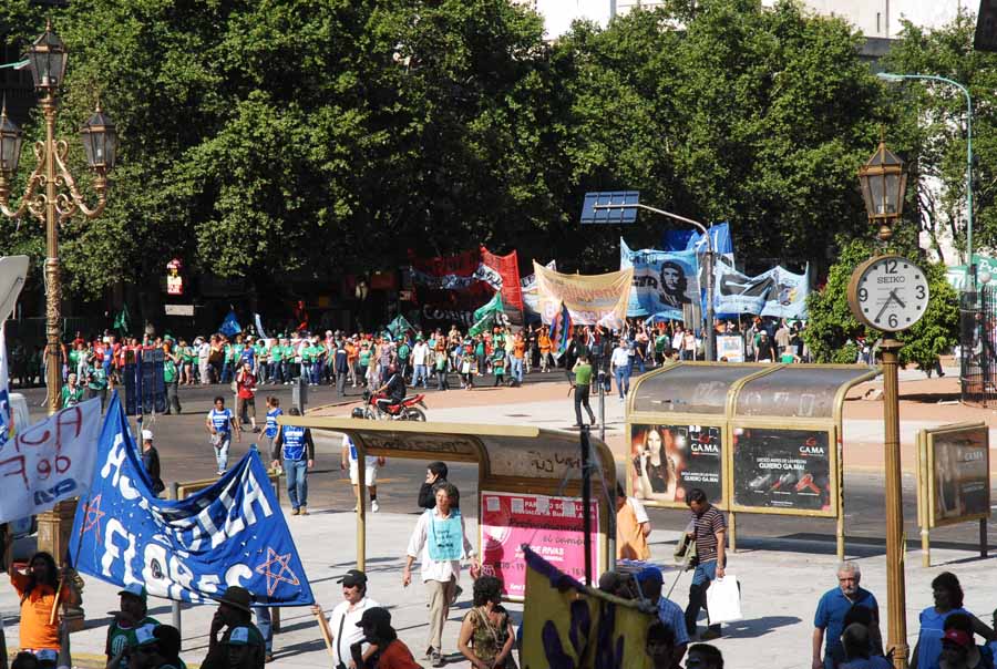 A los manifestantes de la Asociación Trabajadores del Estado (ATE-CTA), que hoy cumplieron un paro nacional de actividades, se sumaron sus pares judiciales, quienes también realizaron una huelga en distintas provincias del país. Estaban los motoqueros del SIMeCa; los gastronómicos del NOS; los trabajadores del neumáticos del SUTNA y los visitadores médicos de AAPM. Los jubilados marcharon junto a los Chicos del Pueblo, los médicos de la CICOP, los profesionales del CePETel, los actores, la Juventud de la CTA y los de la energía enrolados en la FeTERA. Estuvieron también las Organizaciones Libres del Pueblo (OLP) y Quebracho.