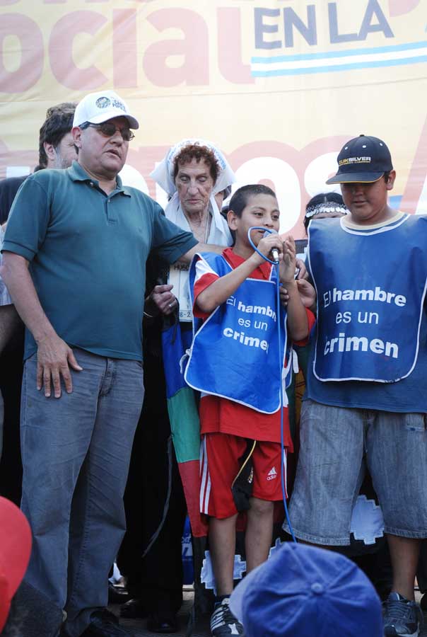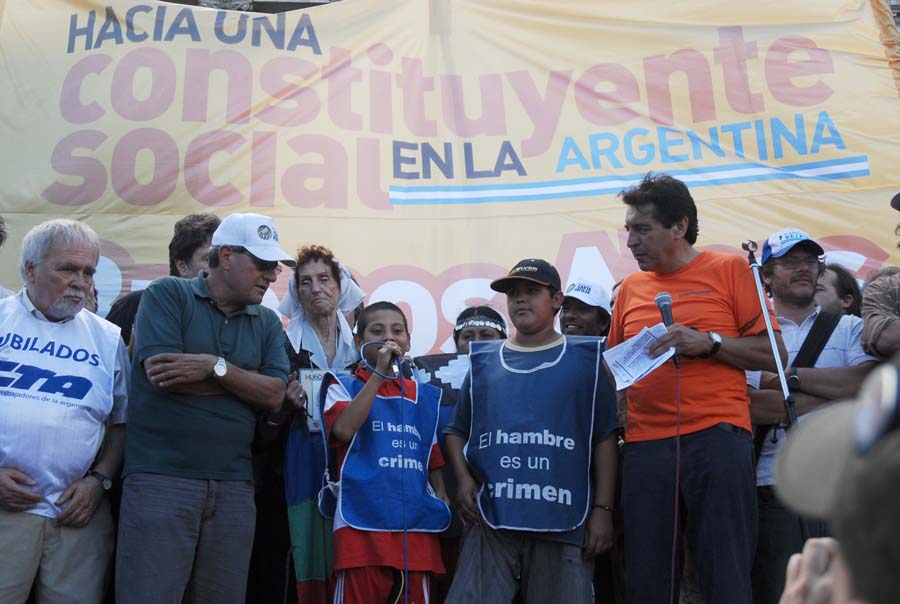 Durante el acto se fueron presentando cada uno de los ejes de las campañas públicas en la voz de distintos representantes de la CTA y de las organizaciones que participan de esta construcción constituyente. Los primeros que hablaron fueron Axel y Brian, del Movimiento Nacional de los Chicos del Pueblo, quienes con sus pocas palabras y una canción resumieron el reclamo por una justa distribución de la riqueza y por la implementación de una Asignación Universal por Hijo de 300 pesos. “Vinimos para apoyar a todos los que están acá, porque nosotros siempre los vamos a apoyar. Y donde ustedes estén vamos a estar nosotros”, dijo Axel. Y Brian cantó: “A ver, a ver, quien dirige la Argentina. Una manga de ladrones o la marcha por la vida, vida, vida”.