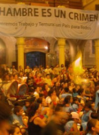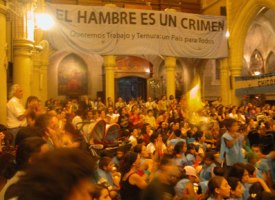 Debajo del lienzo, esta tarde del miércoles 23 de diciembre, casi como un espejo, vemos niños que tienen el color de la tierra, y que festejan los juegos y trucos del animador. En la nave central del templo y en las laterales, sentados o parados, hombres y mujeres. Y también pancartas, pancartas que dicen “El Hambre es un Crimen”, “Digamos basta”. O que dicen “Con ternura, venceremos”.