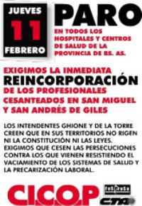 La Asociación Sindical de Profesionales de la Salud de la Provincia de Buenos Aires (CICOP-CTA) comunicó que el próximo jueves llevará un paro de actividades de 24 horas en los 77 hospitales bonaerenses en reclamo por los despidos de los dirigentes gremiales en San Miguel y San Andrés de Giles.