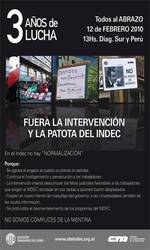 Bajo el lema "Fuera la Intervención y la patota del Indec", la Junta Interna de la Asociación de Trabajadores del Estado (ATE-CTA) del Instituto Nacional de Estadísticas y Censos realizarán un abrazo simbólico al organismo al cumplirse tres años de lucha por la transparencia. El mismo se llevará a cabo en Diagonal Sur y Perú, hoy, a las 12.00.