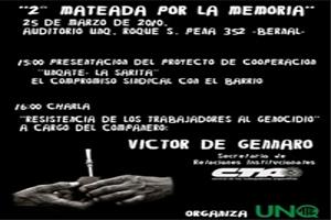 Antes de finalizar “la mateada”, De Gennaro lanzó una propuesta a los trabajadores de la Universidad de Quilmes organizados en UNQATE, convocantes de la actividad. El dirigente expresó “sería importante juntarnos el año que viene teniendo en nuestras manos una investigación que refleje la resistencia en esta zona, que fue mucha, las comisiones eclesiales de base, las 25 agrupaciones sindicales, la regional de la CGT entre otras experiencias. Hay una historia, la de los trabajadores, que a veces no se quiere contar porque no conviene. Hay que recordar para proyectar, traer la memoria de aquellos luchadores, a los compañeros desaparecidos como protagonistas de la historia y no como víctimas” finalizó el dirigente.