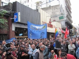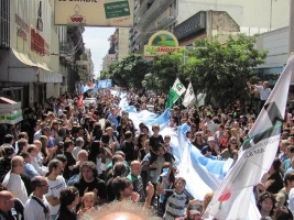 Una multitud calculada en unas ocho mil personas participó hoy del "Banderazo" en reclamo de la reincorporación de los 26 trabajadores de prensa despedidos en LT8 y LT3 de Rosario, propiedad del Grupo Uno del dúo Vila-Manzano.