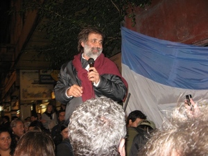 Entonces, el dirigente de la Federación de Trabajadores de la Cultura y la Comunicación (FETRACCOM-CTA) habla de que esto es el principio y que se necesita fortaleza para aguantar lo que se viene, y también dice que por segunda vez –la anterior había sido tras el infame asesinato del compañero docente Carlos Fuentealba en Neuquén- , la Central de Trabajadores de la Argentina y la CGT, de la mano de sus dos secretarios generales se unían para apoyar la pelea de la Multisectorial de Medios Rosario en contra de los 26 despidos, y el grito que surge, “Ni Vila ni Manzano, Yasky y Moyano”, y Carmona cuenta que finalmente el Grupo Uno tuvo que acatar la Conciliación Obligatoria dictada hace ya una semana por el Ministerio de Trabajo de la provincia de Santa Fe, y que el multimedios no acataba, y entonces habla bien de Carlos Rodríguez, ministro santafesino de trabajo, y de Carlos Tomada, Ministro de Trabajo de la Nación, y agradece a la Presidenta, a los senadores y diputados nacionales y provinciales y a los concejales de Rosario, pero principalmente al pueblo de Rosario y todas las organizaciones que bancaron la lucha, y recuerda el “Banderazo del sábado”.
