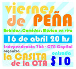 Esta noche a partir de las 20 horas se llevará a cabo una peña en la sede de la CTA Capital, sita en la Avenida Independencia 766. Organizada por La Casita de la CTA, la misma contará con música en vivo, comidas y bebidas.
