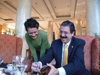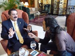 El presidente depuesto de Honduras Manuel Zelaya -que actualmente es coordinador del Consejo Político de Petrocaribe- luce un traje negro, camisa blanca y una corbata mostaza, su pelo negro engominado pero sin el clásico sombrero con el que se lo vio en las diferentes instancias antes y después del golpe de Estado del 28 de junio de 2009. Recibe cerca de las 16 a ACTA en el lobby del Hotel Sheratton, en el barrio porteño de Retiro, invitado por la presidenta Cristina Fernández de Kirchner a los festejos del Bicentenario, de quien se mostró agradecido “por el gesto”.