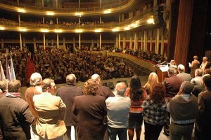 El Teatro Coliseo Podesta colmado durante el festejo de la AJB por su cincuentenario. Tales exteriorizaciones emotivas sobresalieron cuando se rindió homenaje a los compañeros judiciales desaparecidos en la lucha contra la dictadura, y al entregarse presentes a los dirigentes que presidieron la AJB en estos 50 años, como Antonio Cortina, Julio Bertomeu, Néstor Rompani, Víctor Mendibil, Omar Gorini (otro de los fundadores de la AJB), Ricardo Rojas, Rubén Aldo Andreoli, Mario García y al actual secretario general Hugo Blasco.