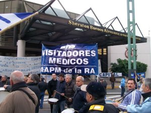 Cientos de trabajadores nucleados en a Asociación de Agentes de Propaganda Médica escracharon un congreso de ginecología que los laboratorios medicinales realizaban en el Hotel Sheraton. Esta medida dio comienzo al plan de lucha en el marco de las paritarias donde reclaman un 42% de recomposición salarial al básico y mejoras en el Convenio Colectivo en licencias por maternidad/paternidad, jornada de trabajo y vacaciones, salud laboral, sala materno-paternal, entre otras demandas.