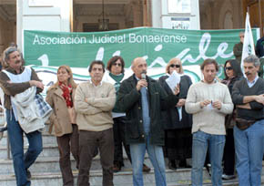 En el marco del paro de actividades dispuesto por la AJB, los principales dirigentes de la mesa provincial participaron de un acto frente al Palacio de Justicia bonaerense, sede de la Suprema Corte. El gobierno anunció que accederá a una de las reivindicaciones de recategorización planteadas por el gremio de los judiciales.