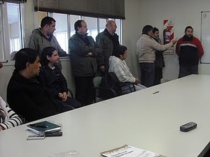 En Villa Constitución: con la jueza que tiene a su cargo el concurso preventivo. Se reunen Carlos Vásquez, Tesorero de la UOM, Alebrto Churichi de la Comisión Interna y Ramón Godoy, colaborador.