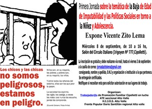 Organizado por ATE Alto Valle, Trabajadores de Promoción Familiar agremiados en ATE, Hijos Alto Valle, MTD y el Frente Popular Darío Santillán regional Alto Valle se realiza la Iº Jornada sobre la temática de la Baja de Edad de Imputabilidad y las Políticas Sociales en torno a la Niñez y Adolescencia