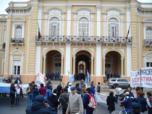 Durante el acto, "repudiamos el acuerdo firmado por los gremios afines al Gobierno como lo son ADP, AMET, SADOP (Docentes) y UPCN que, traicionando los intereses de sus pares aceptaron el vergonzante 25% otorgado por el Gobierno que comenzarán a aplicarse recién en cuotas el año que viene y sumas en negro los tres últimos meses del año", indica un comunicado gremial.