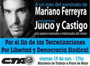 La Central de Trabajadores de la Argentina (CTA) de la Capital Federal convoca a participar de la movilización que se llevará a cabo este viernes 19 de noviembre, al cumplirse un mes del asesinato del compañero del PO Mariano Ferreyra.