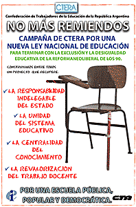 Yasky consideró “imperioso definir una nueva Ley Nacional de Educación, un nuevo marco de legalidad institucional que nos permita superar el actual estado de fragmentación y desigualdad, por el que en el país coexisten 54 modalidades diferentes de escuela secundaria”. Además, el dirigente de la CTERA y de la CTA explicó que el gremio docente lanzó una “campaña nacional” por este tema y que “durante el año 2005, las entidades de base de CTERA realizaron Congresos Educativos Provinciales para elaborar sus propuestas”.
