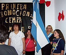 La secretaria general de AMMAR nacional, Elena Reynaga realizó las gestiones pertinentes ante la CTERA, y a través de Hugo Yasky, le consiguió una bandera de ceremonia a las chicas de AMMAR-Córdoba y fue la que estrenó con un inocultable orgullo Norma Beatriz Pacheco, junto a las escoltas Angelina Sanramé y una de las egresadas, Pamela Gosteli. El otro flamante egresado, Carlos Flores no concurrió al acto porque "gracias a Dios encontró trabajo", según la gráfica expresión de su maestra Sandra Alamo.